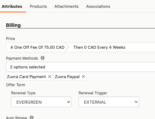 The Billing attributes of the Offer will determine the Price as well as some core attributes of the subscriptions, such as the Payment Methods available at Checkout, the Initial and Renewal Terms, and the Auto-Renewal status.